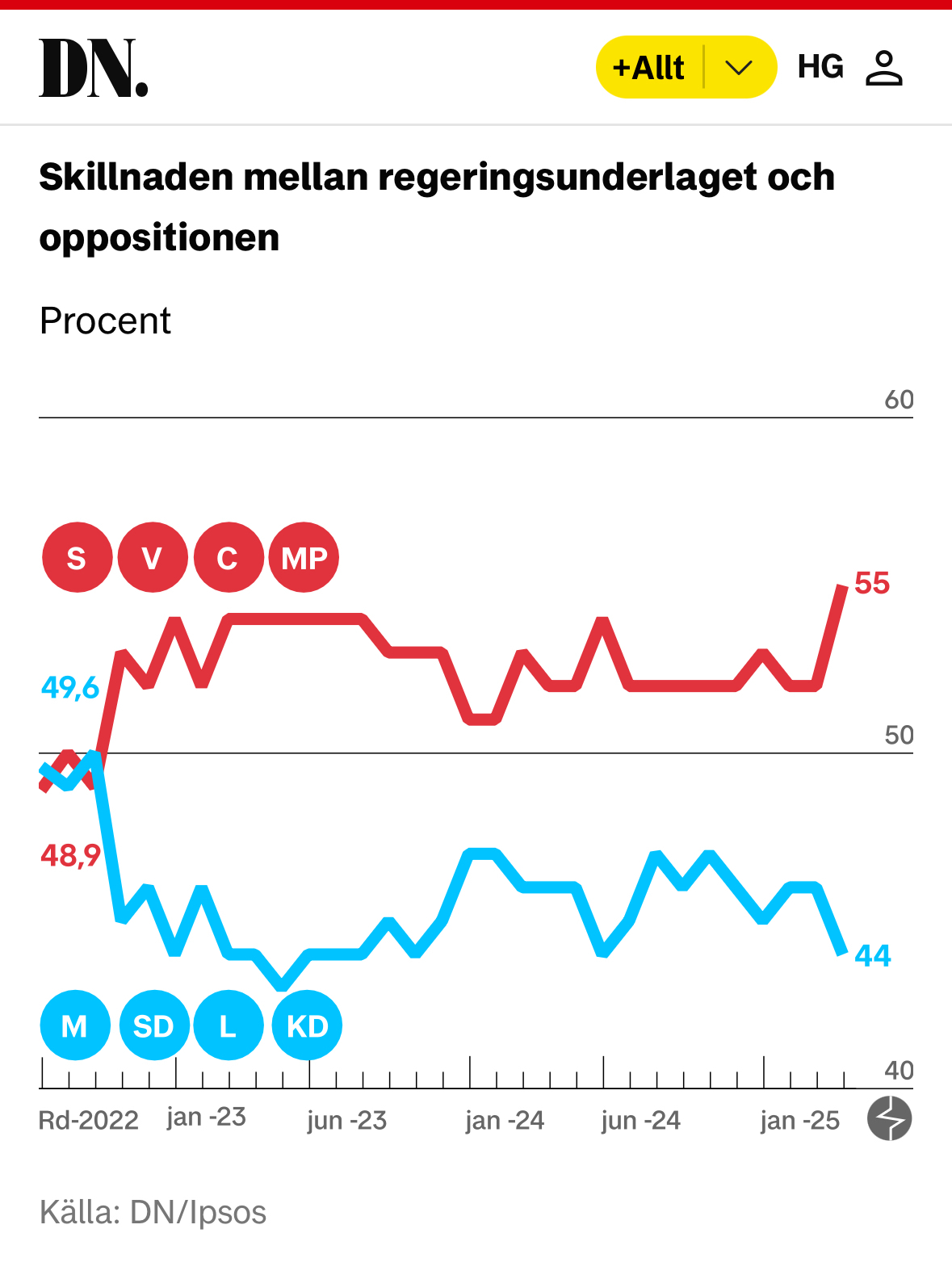 Visa på Bluesky →Anmärkningsvärda siffror, som man brukar säga. https://www.dn.se/sverige/storsta-gapet-hittills-mellan-blocken-l-har-tappat-halften-av-sina-valjare/