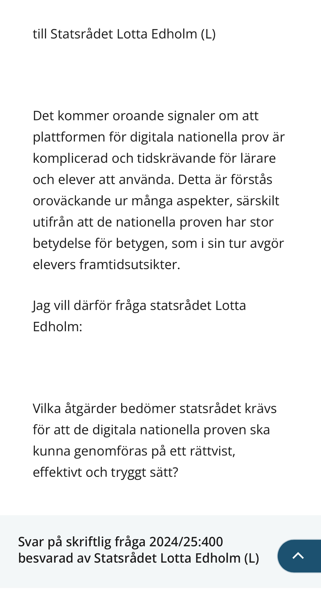 Visa på Bluesky →Digitala nationella proven inställda. I november frågade jag Edholm om vilka åtgärder som behövde vidtas för att de digitala nationella proven skulle gå att genomföra. Redan då fanns stor oro. Edholm verkade dock tycka att allt var i sin ordning.
