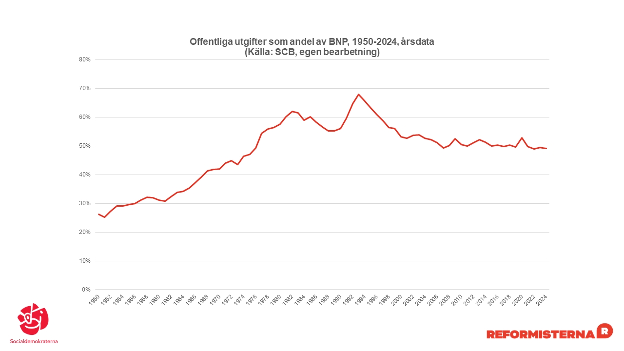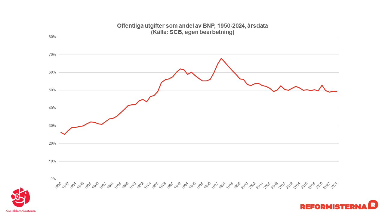 Den långsiktiga utvecklingen för offentlig sektor som andel av samhällsekonomin. Lägg till marknadiseringen och vinstjakten i välfärden, så får du ett bra grepp om den historiska helheten, tänker jag.