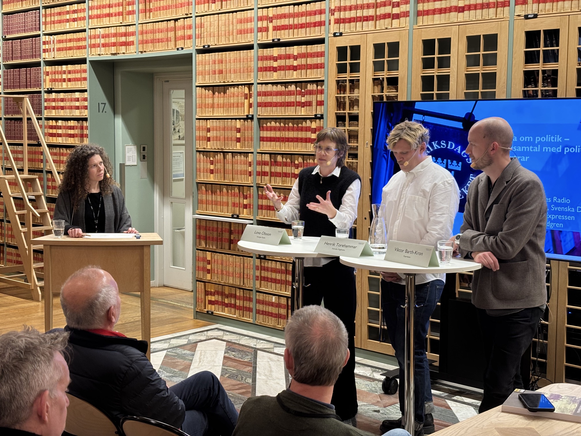 Visa på Bluesky →Dagens kvällsunderhållning i riksdagsbiblioteket: Lova Olsson, Henrik Torehammar och Viktor Barth-Kron om de politiska poddarna. Festligt, folkligt och fullsatt!