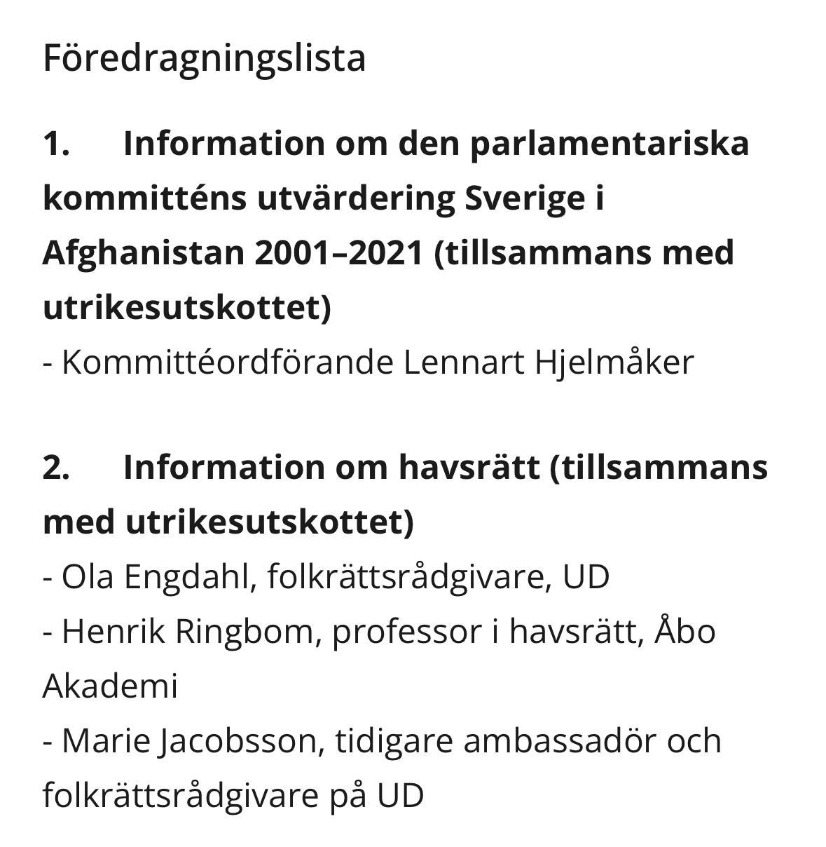 Visa på Bluesky →Maffigt och innehållsrikt utskottsmöte idag. Först om Afghanistan och den utredning som gjorts, sedan kunskapsinhämtning om havsrätten och Östersjön.