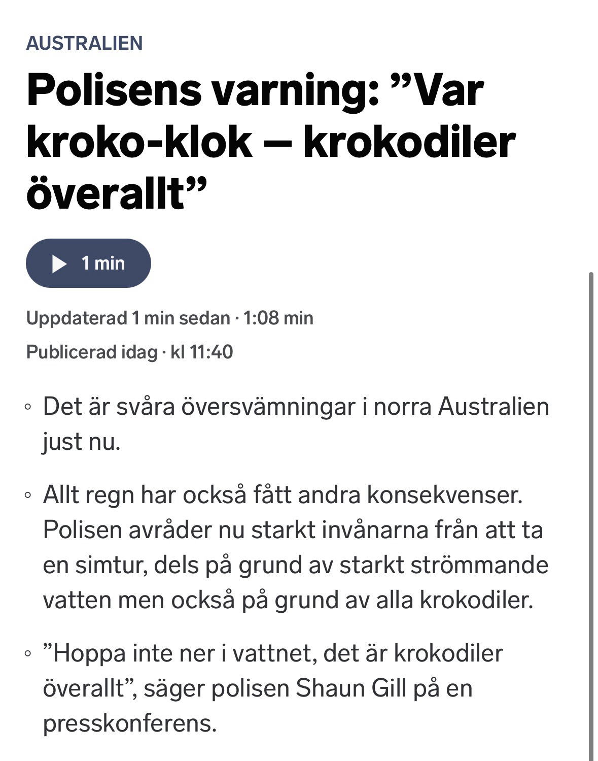 Visa på Bluesky →Oerhört tacksam för att jag bor i ett land utan krokodiler. Och alla andra farliga djur som Australien har fått som sin beskärda del av världens jobbigheter.