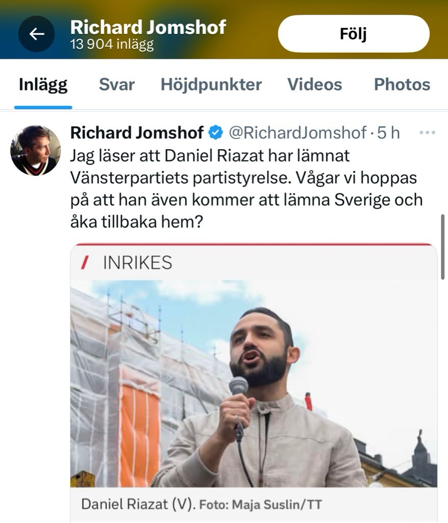 Helt oacceptabelt uttalande av Jomshof om en riksdagsledamot och medmänniska. Jag förväntar mig att Sverigedemokraterna och regeringen agerar.
